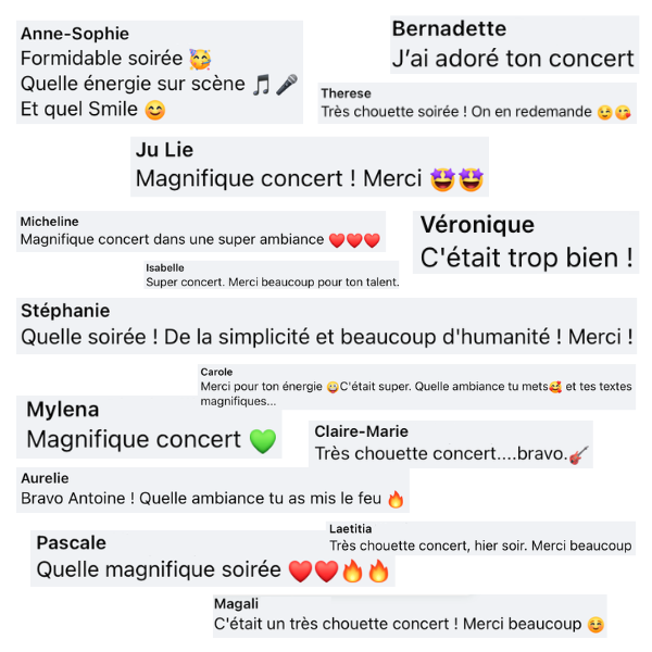 Non. Nous préférons être honnêtes et clairs sur ce point : Antoine Armedan ne fait que des concerts, avec de vrais moments dédiés à sa musique et un public présent pour écouter, voir et participer. Nous ne sommes donc pas disponibles pour des événements souhaitant une animation ou une musique d'ambiance.